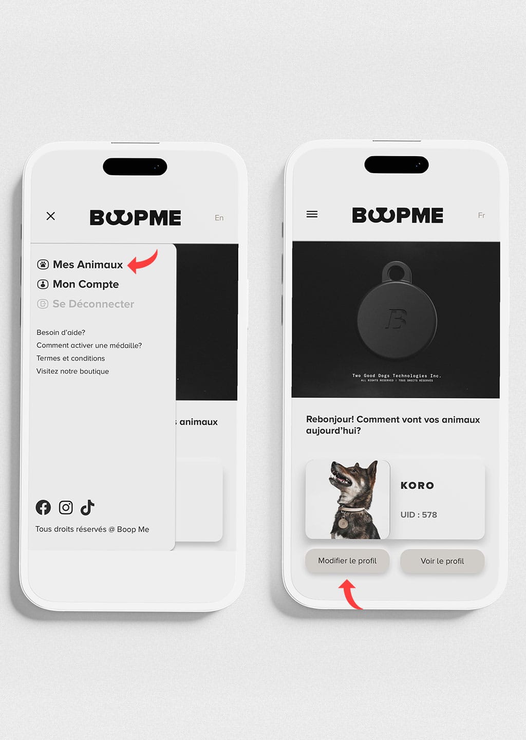 Aucune application n’est requise pour utiliser un médaillon BOOPME™ car nous voulions le rendre accessible sur tous les appareils (que quelqu’un possède ou non un médaillon BOOPME™). Tout ce dont vous avez besoin est une connexion Internet et un appareil intelligent pour personnaliser et accéder au profil de votre animal.